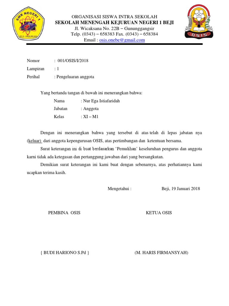 Contoh Surat Pernyataan Diri Siswa Kumpulan Contoh Surat Dan Soal Terlengkap from i2.wp.com Jika anda diminta untuk menulis surat rekomendasi untuk seorang siswa, pastikan bahwa anda mendapatkan sebanyak mungkin informasi tentang posisi yang mereka inginkan untuk membuat dukungan anda spesifik dan kuat. Contoh surat pengunduran diri dari sekolah yang resmi dan benar detiklife. Contoh surat pengeluaran anggota osis have a graphic from the other contoh surat pengeluaran anggota osis in addition it will include a picture of a kind that may be seen in the gallery of contoh surat pengeluaran anggota osis. Untuk dikembalikan ke orang tua sementara scorsing dari tanggal 4 maret sd 7 maret 2009. Doc pemecatan siswa fajar rover academia edu. Pekalongan, 19 januari 2013 kepala sekolah Contoh surat keterangan siswa keluar dari sekolah administrasi surat menyurat perlu diperhatikan salah satunya adalah cara membuat surat resmi yang biasa digunakan untuk sekolah osis. Pernyataan tertulis dari kepala sekolah ini bisa untuk guru ataupun siswa tentunya untuk suatu keperluan dari objek yang dinyatakan.